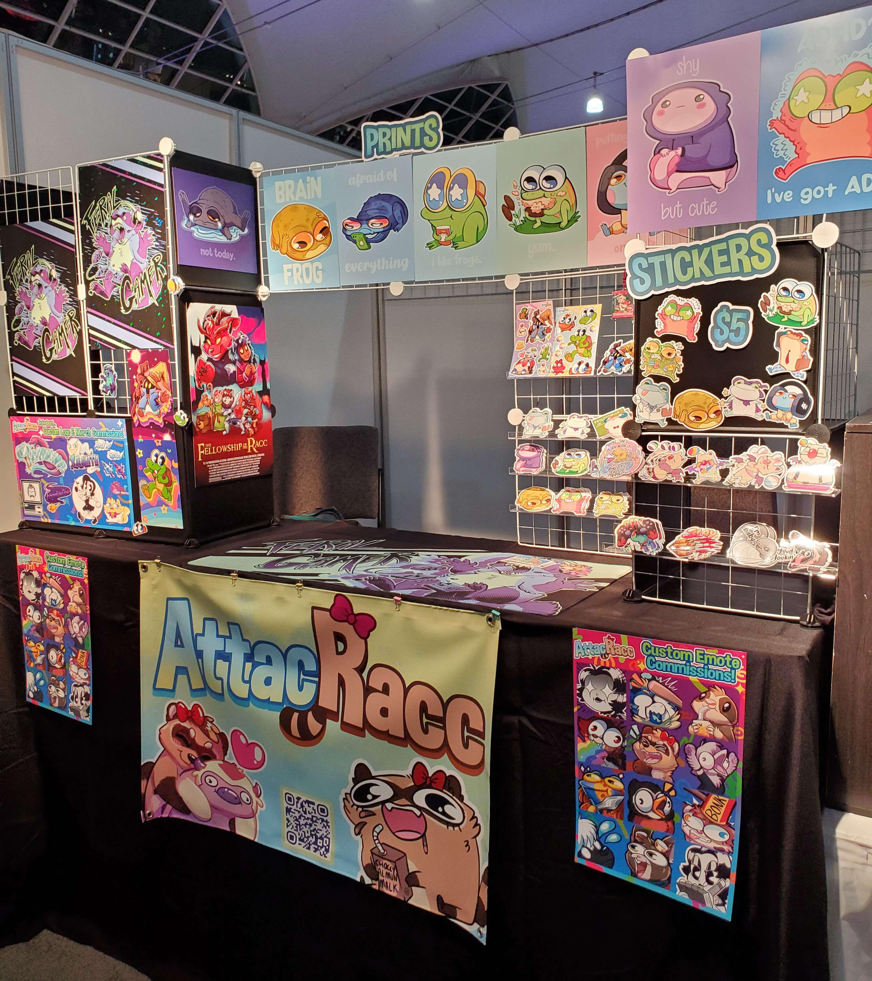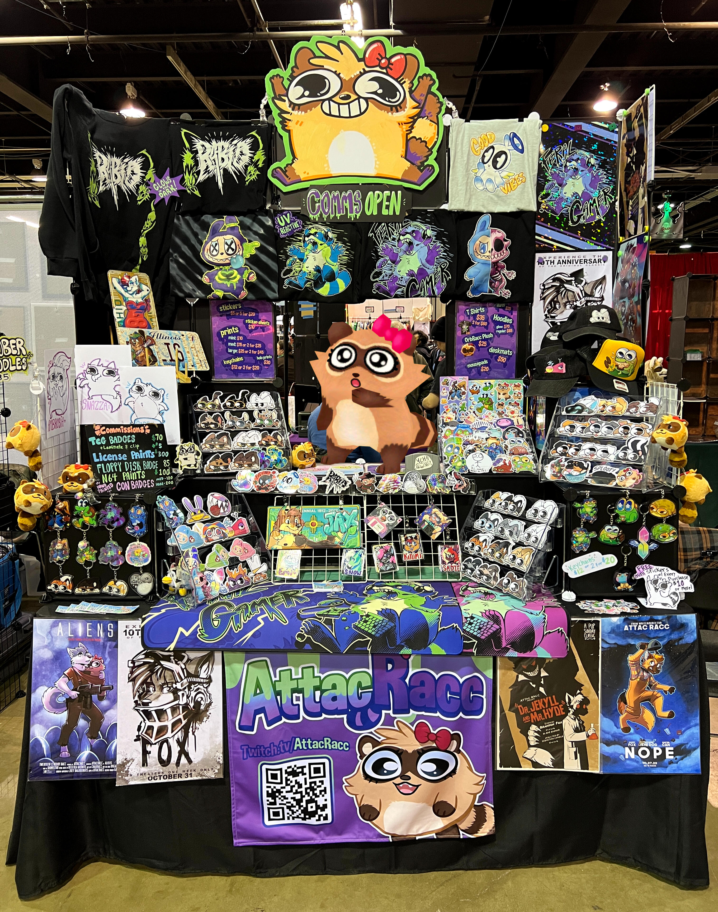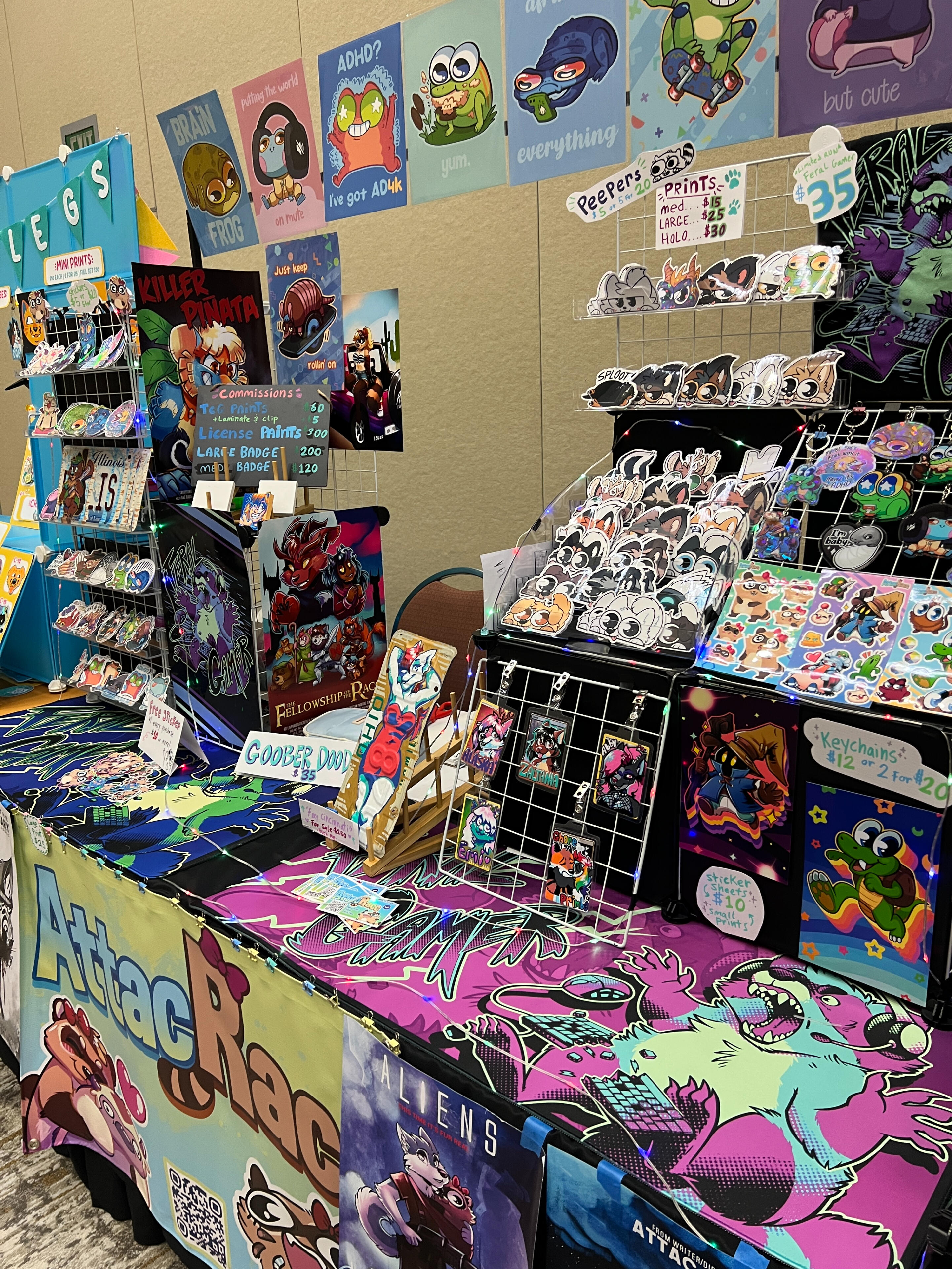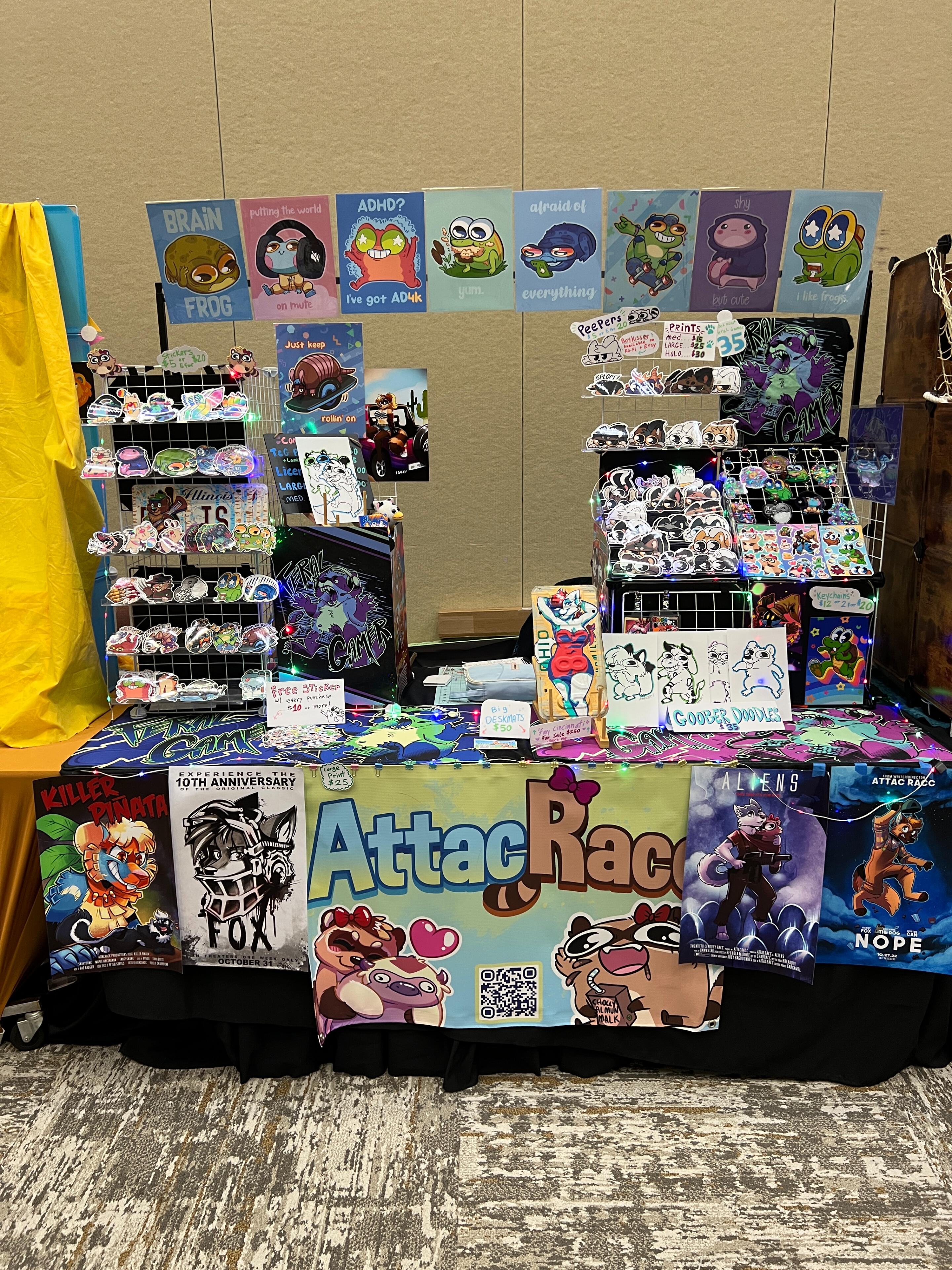 Hey, I’m AttacRacc, a full-time artist & content creator!I’m a queer and neurodivergent artist sharing vibrant, nostalgic, and bold designs at conventions across the U.S. My "con-artist" journey began at Twitchcon 2024, and since then I’ve had the honor of vending at multiple conventions.My passion for printmaking has led me on a journey of both designing my own merch, and printing/producing it in-house as well. I strive to be as self-sufficient as possible by reducing outsourcing in my merch line whenever possible.At my booth, I bring a mix of original paintings, merch, and also offer at-table commissions! I have a mix of material to suit each individual convention and fandom, and enjoy making new designs for every con I attend!