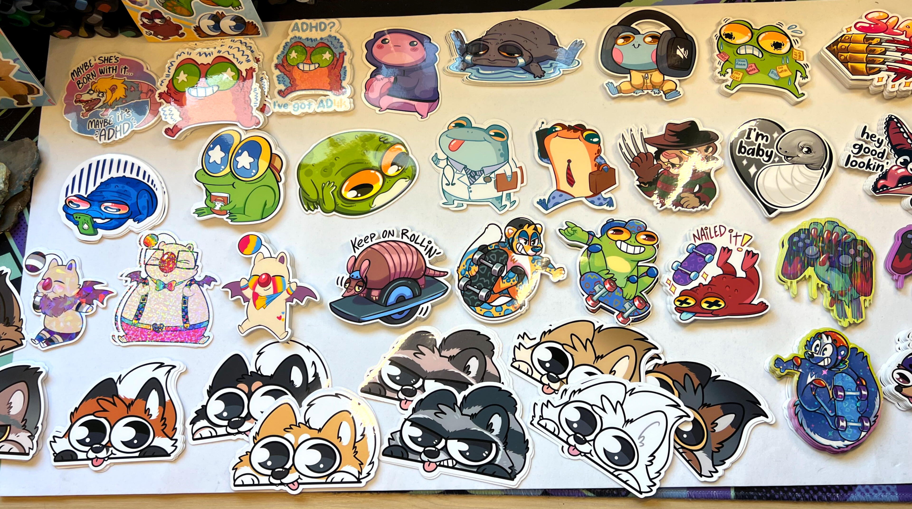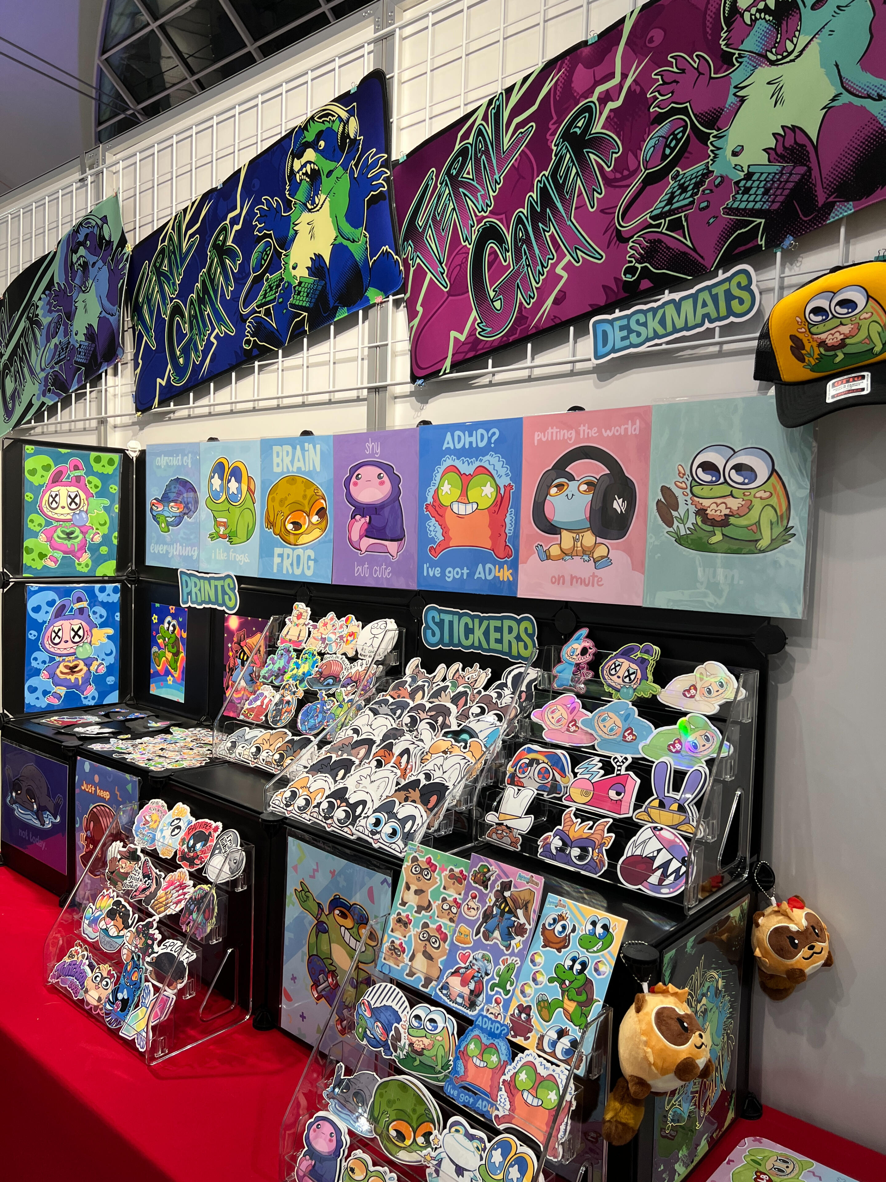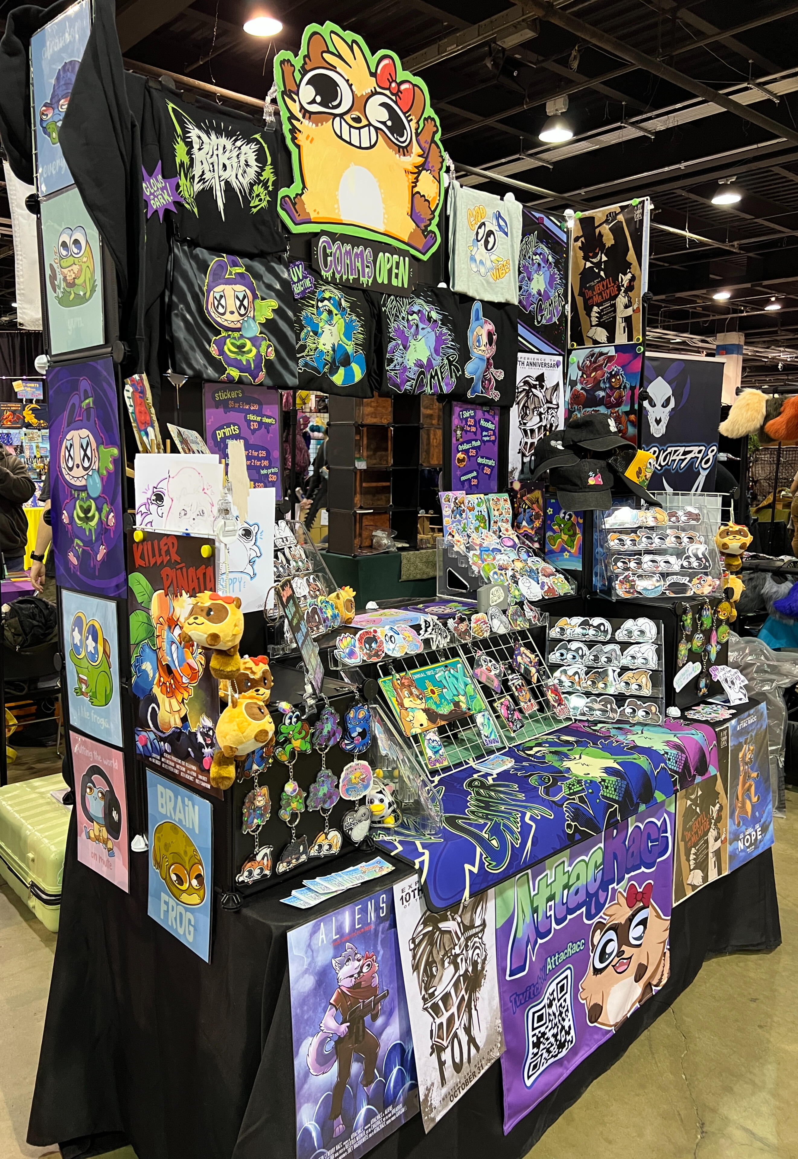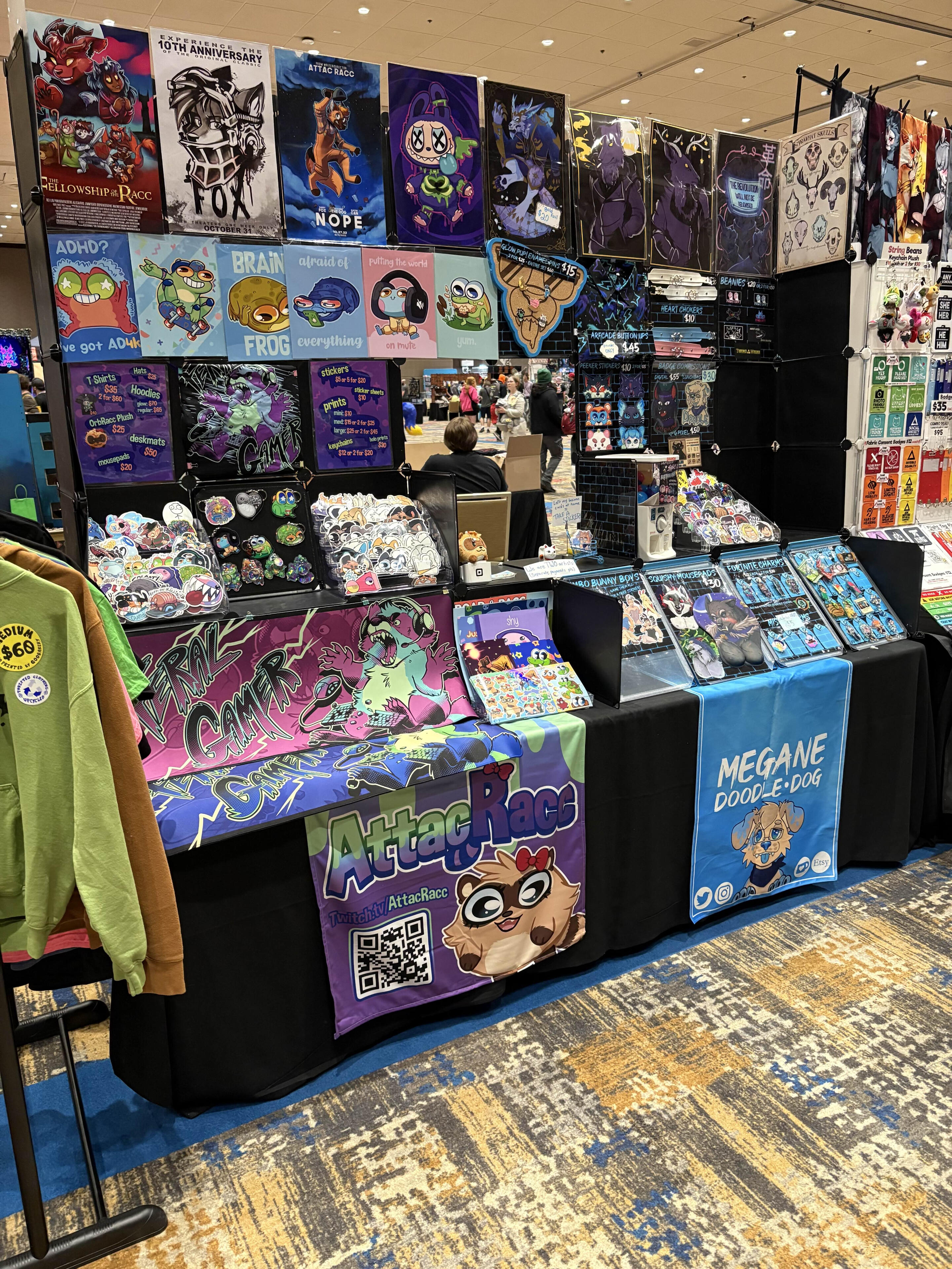 Hey, I’m AttacRacc, a full-time artist & content creator!I’m a queer and neurodivergent artist sharing vibrant, nostalgic, and bold designs at conventions across the U.S. My "con-artist" journey began at Twitchcon 2024, and since then I’ve had the honor of vending at multiple conventions.My passion for printmaking has led me on a journey of both designing my own merch, and printing/producing it in-house as well. I strive to be as self-sufficient as possible by reducing outsourcing in my merch line whenever possible.At my booth, I bring a mix of original paintings, merch, and also offer at-table commissions! I have a mix of material to suit each individual convention and fandom, and enjoy making new designs for every con I attend!